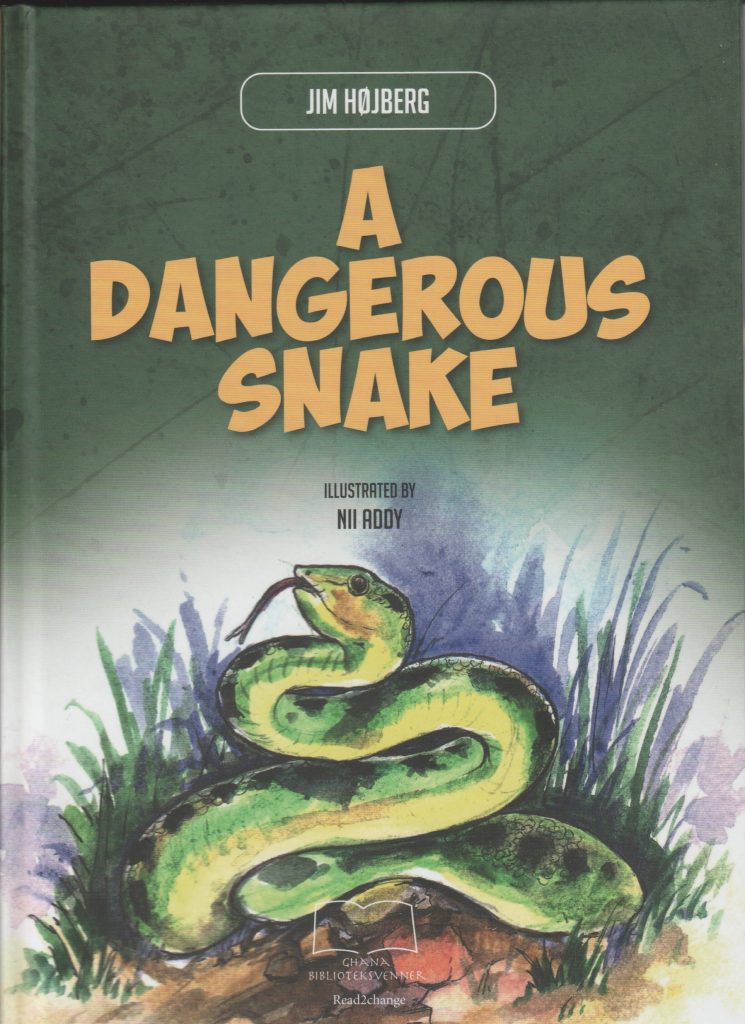 A dangerous snake er en letlæsningsbog på engelsk. Den er skrevet om og til børn i landsbyen Dalun, hvor jeg er med til at lave et bibliotek. Men den kan også læses af danske børn, der er i gang med at lære engelsk.